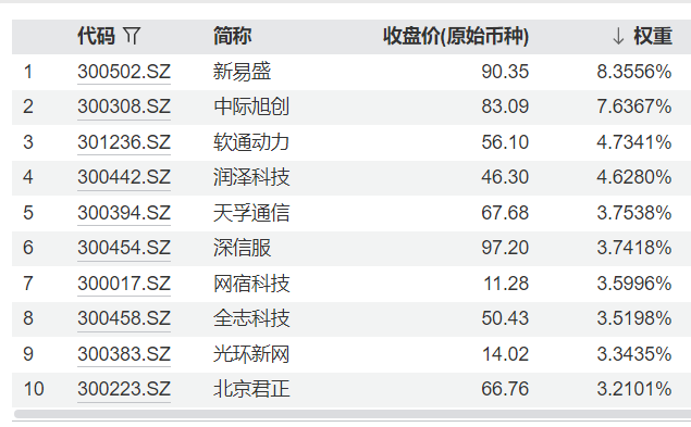 创业板人工智能指数:Wind数据显示,该指数前十大重仓股包括新易盛、中际旭创、软通动力等,“易中天组合”(新易盛、中际旭创、天孚通信)权重累计占比超过19%。