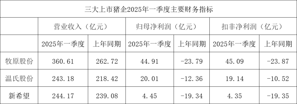 近日,牧原股份(002714.SZ)、温氏股份(300498.SZ)、新希望(000876.SZ)三大上市猪企发布的2025年一季报显示,营收、净利润等多项财务指标较去年同期实现较好增长。