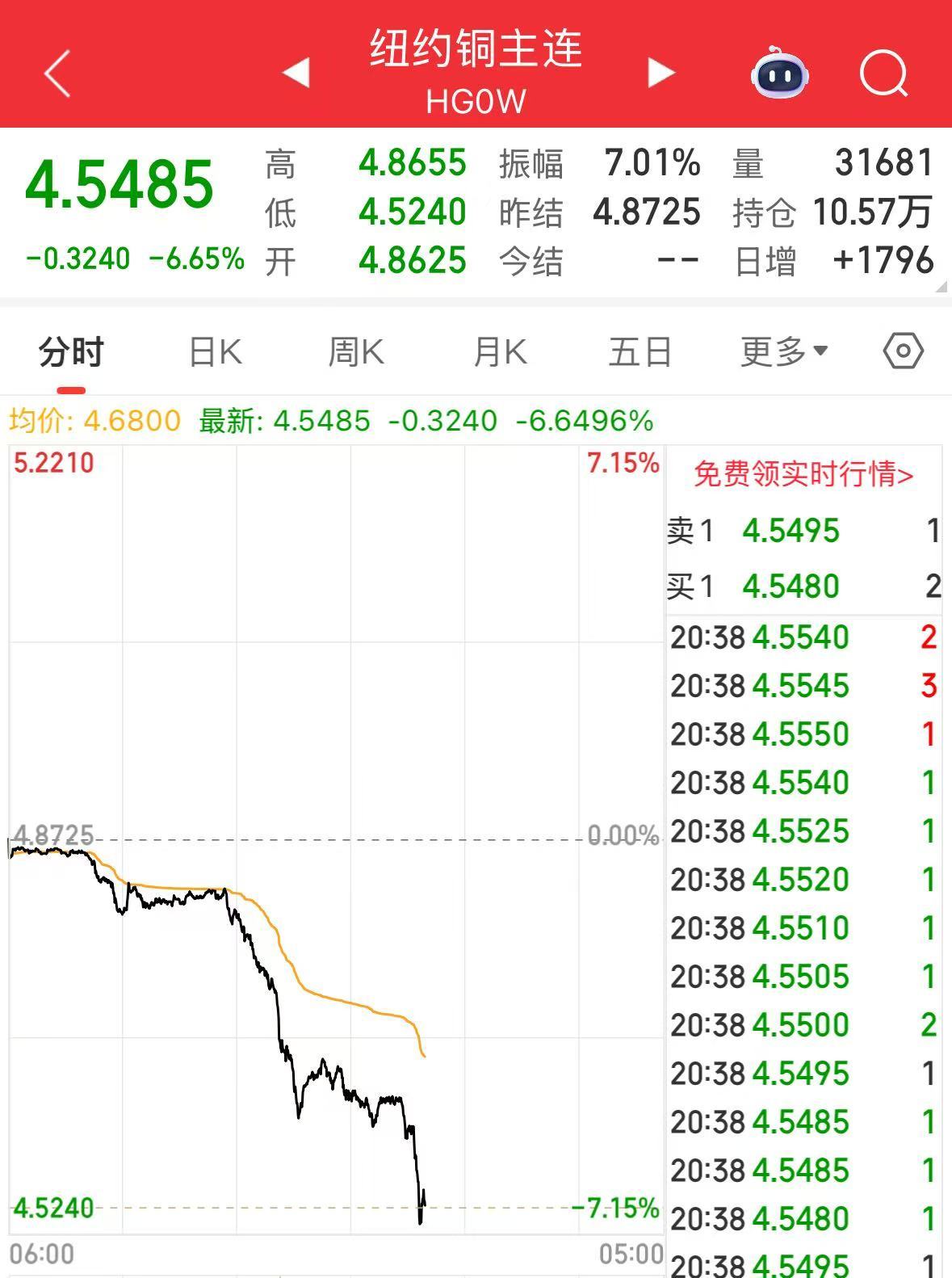 纽约铜期货跌幅扩大至6.5%。