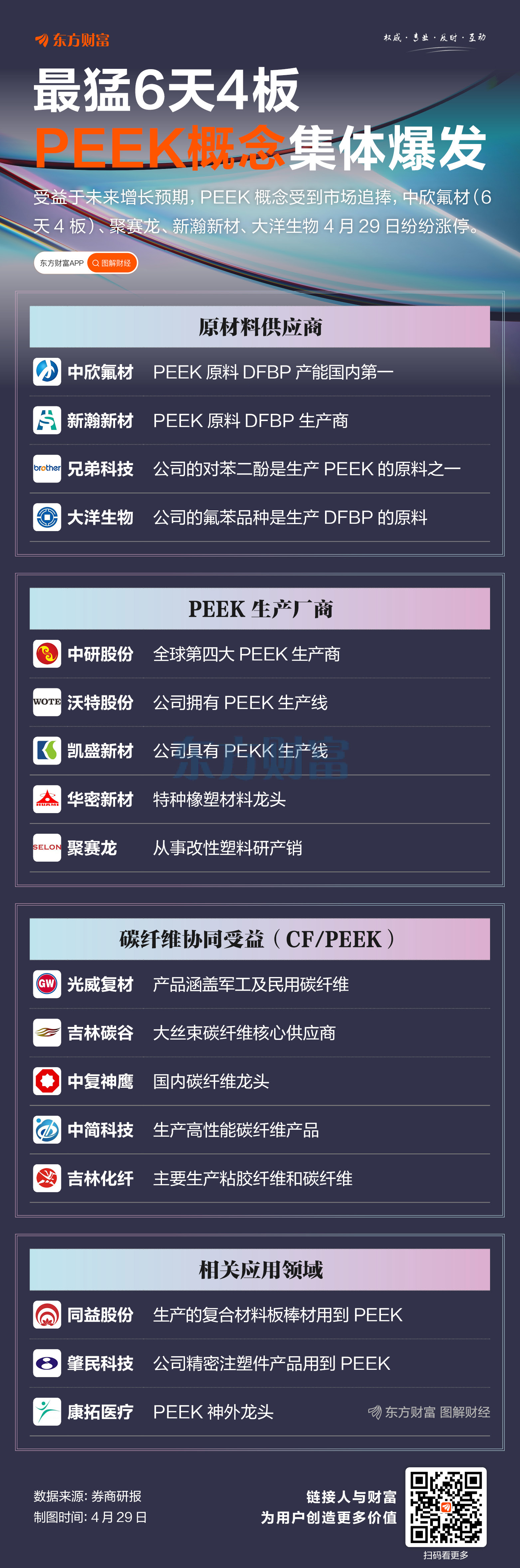 继4月28日后,A股PEEK材料概念4月29日继续走强,收盘指数大涨7.09%,板块中中欣氟材(6天4板)、新瀚新材(4天2板)、大洋生物、聚赛龙涨停。唯科科技、富恒新材、国际复材大涨超10%。中研股份、华密新材、同益股份也涨幅明显。