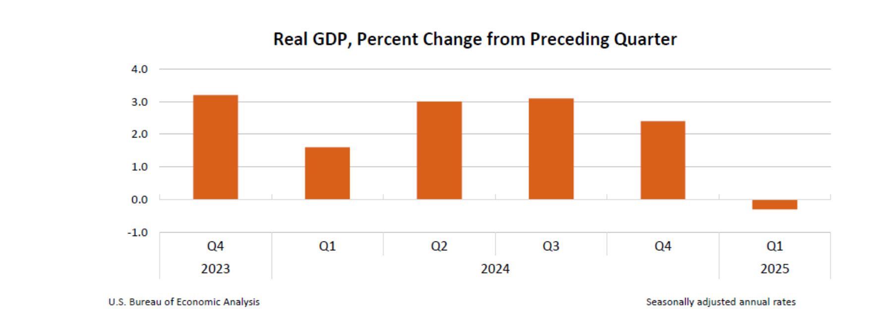 Home期货美国第一季度GDP折合年率下降0.3% 出现2022年以来首次萎缩 期货 2025 年 5 月 1 日 美国第一季度GDP折合年率下降0.3% 出现2022年以来首次萎缩 By 古方信息网 - Advertisement - 美国第一季度GDP季调后环比折年率初值为-0.3%,创2022年第二季度以来新低,预估为-0.2%,前值为2.4%。 受关税行动前进口激增以及消费者支出放缓影响,美国经济在今年第一季度出现2022年以来的首次萎缩,标志着特朗普贸易政策所带来的连锁反应初步显现。 美国经济分析局的报告显示,净出口拖累GDP接近5个百分点。占GDP三分之二的消费者支出折合年率增长1.8%,是自2023年中以来的最低水平。报告中的一个亮点是企业设备支出,折合年率增长了22.5%。 (财联社) 文章转载自 东方财富 - Advertisement - Must Read 基金 多位基金经理去年下半年继续增持;信达澳亚基金李晓西离任 古方信息网 - 2026 年 4 月 13 日 - Advertisement - 24小时 伊朗革命卫队:霍尔木兹海峡允许非军事船只通过 2026 年 4 月 13 日 股票 万斯率美代表团抵达,美方300人、伊方71人,阵容公布,数千美军集结中东;号称年入18亿美元的“一人公司”翻车 | 一周国际财经 2026 年 4 月 13 日 期货 美中央司令部:4月13日起封锁伊朗港口海上交通 2026 年 4 月 13 日 Related News 基金 多位基金经理去年下半年继续增持;信达澳亚基金李晓西离任 2026 年 4 月 13 日 24小时 伊朗革命卫队:霍尔木兹海峡允许非军事船只通过 2026 年 4 月 13 日 股票 万斯率美代表团抵达,美方300人、伊方71人,阵容公布,数千美军集结中东;号称年入18亿美元的“一人公司”翻车 | 一周国际财经 2026 年 4 月 13 日 期货 美中央司令部:4月13日起封锁伊朗港口海上交通 2026 年 4 月 13 日 贵金属 3月24日财经早餐:美伊谈判虚实之间,金价深V反弹再决战4500关口,油价暴跌近11% 2026 年 4 月 13 日 - Advertisement -
