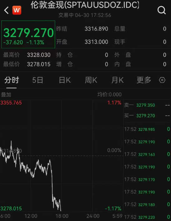 4月30日,黄金价格跳水,截至发稿,现货黄金跌破3280美元/盎司关口,最新报3279.27美元/盎司,日内跌1.13%;COMEX黄金期货主力最新报3294.1美元/盎司,日内跌1.18%。