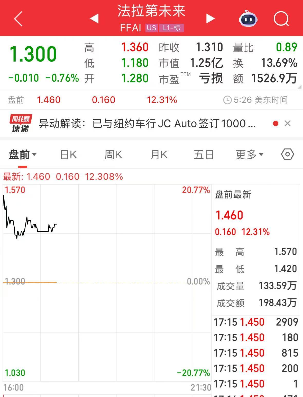 截至发稿前,法拉第未来美股盘前涨超12%。值得注意的是,近期公司股价迎来大涨,近一周已累计上涨超50%。