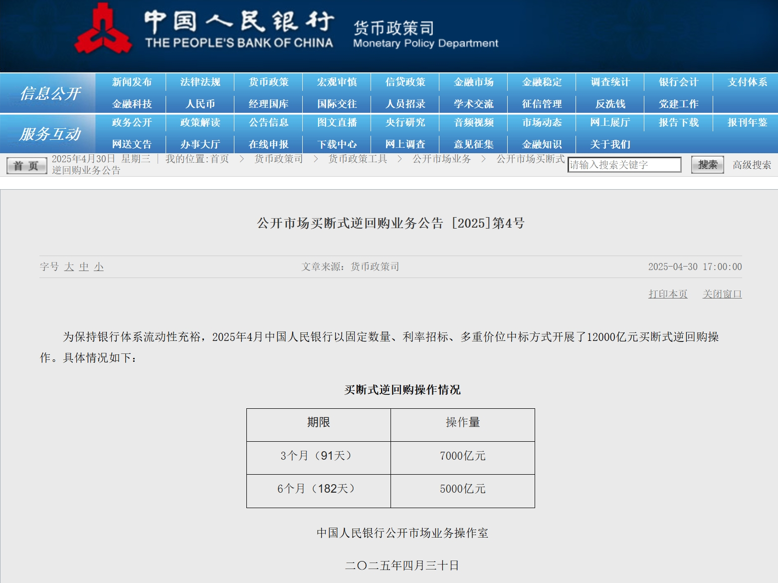 4月30日,据央行网站消息,2025年4月中国人民银行以固定数量、利率招标、多重价位中标方式开展了12000亿元买断式逆回购操作。