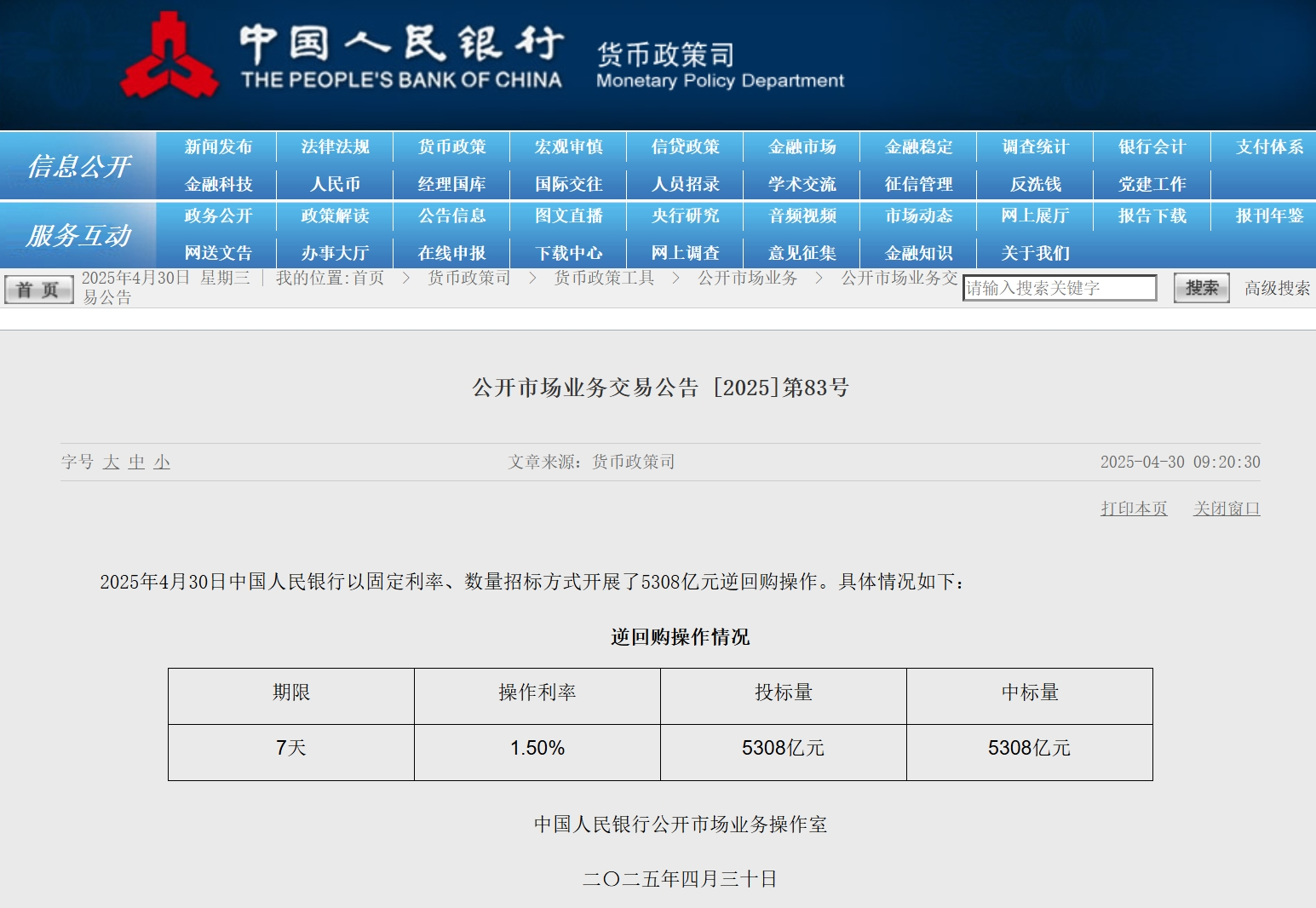 同日,央行还公告称,2025年4月30日中国人民银行以固定利率、数量招标方式开展了5308亿元逆回购操作,中标利率为1.5%。
