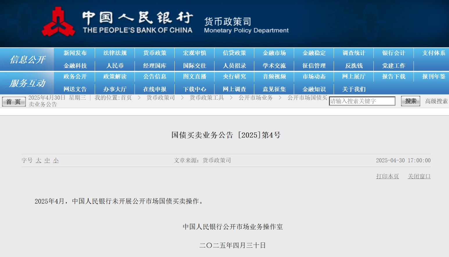 此外,2025年4月,中国人民银行未开展公开市场国债买卖操作。