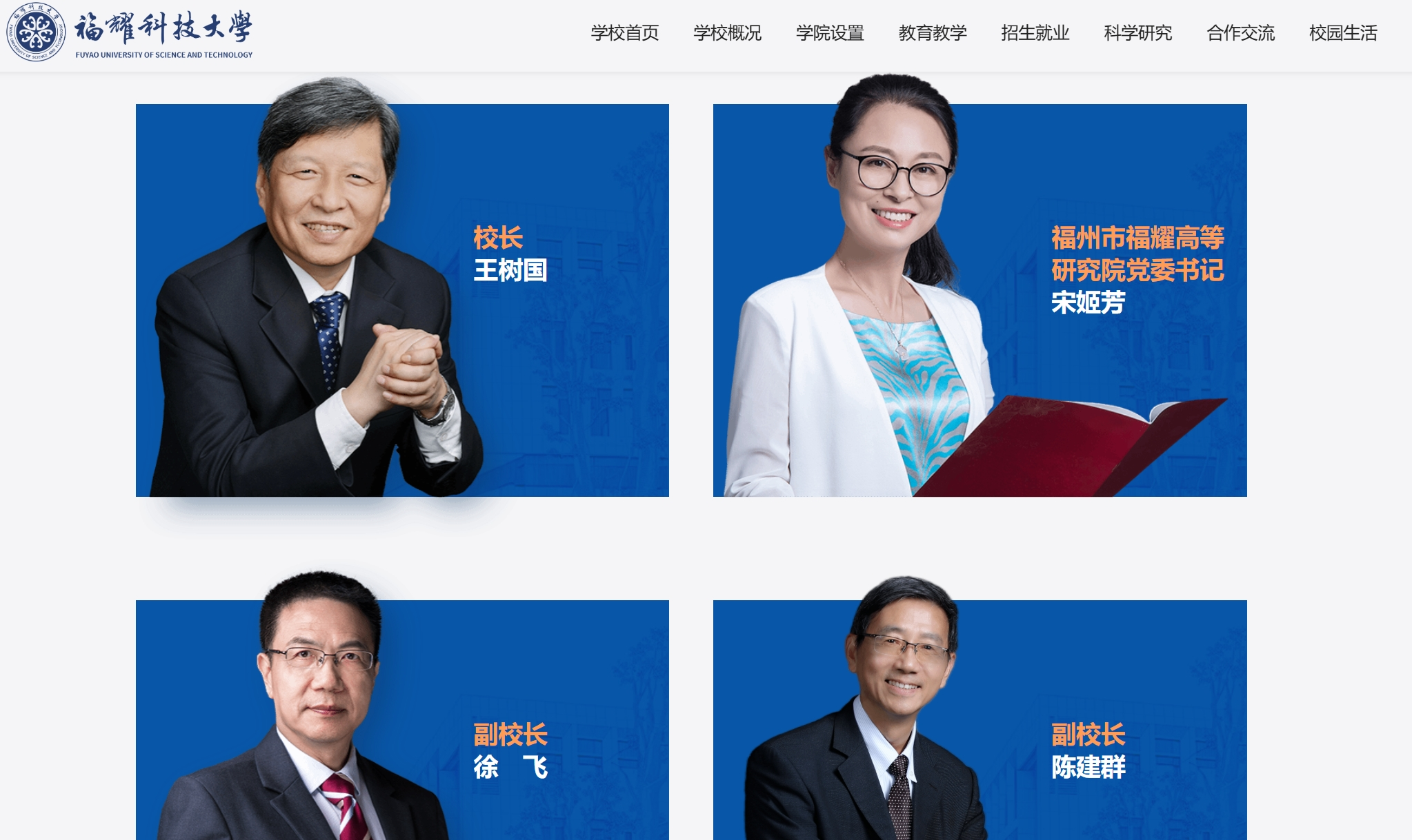 此前,福建福耀科技大学官网更新学校领导页面,该校现任领导正式亮相,分别是校长王树国,福州市福耀高等研究院党委书记宋姬芳,副校长徐飞、陈建群。