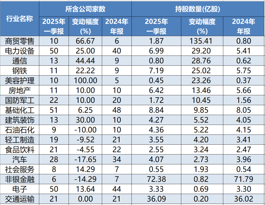 据记者统计,从社保基金持仓的行业分布来看,2025年一季度,社保基金主要增持商贸零售、电力设备、通信等行业股票,社保基金合计持股数量分别为1.87亿股、6.99亿股、0.8亿股,较2024年年末持股数量增幅分别为135.41%、29.30%和28.76%;三大行业分别持有10家、50家和18家公司,而去年年末分别为6家、40家和9家,社保基金继续扩大上述行业公司的持有范围。