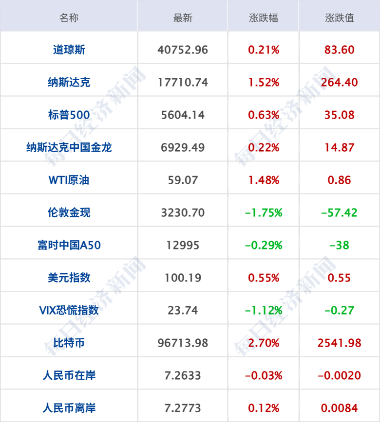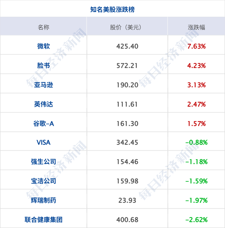 美股三大指数集体收涨,纳指涨1.52%,标普500指数涨0.63%,道指涨0.21%,标普500指数、道指均录得日线八连涨;微软涨超7%,Meta涨超4%,亚马逊涨超3%,英伟达涨逾2%,谷歌涨超1%,苹果、奈飞小幅上涨;特斯拉、英特尔小幅下跌;礼来跌超11%,创2008年以来最大单日跌幅。中概股互有涨跌,纳斯达克中国金龙指数涨0.22%;瑞幸咖啡涨超4%,霸王茶姬涨逾3%,金山云、万国数据涨超2%,富途控股、贝壳等涨超1%,阿里巴巴、京东、携程网、理想汽车等小幅上涨;腾讯音乐、满帮、唯品会等小幅下跌。