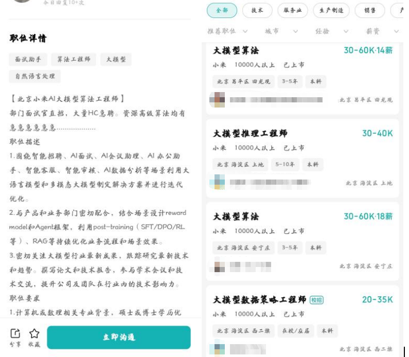 另外,从招聘详情中或可以窥见小米做大模型的方向,如直接表明“文生图,图生图大模型算法”,再如“多模态大模型算法工程师”一职,岗位详情中提到,需要求职者进行大模型算法部署和小型化研究,还需负责大模型算法的落地应用,包括智能门锁、智能音箱等场景。“大模型算法”一职的招聘详情中还提到,求职者需围绕智能招聘、AI面试、AI会议助理、AI办公助手、智能客服、智能审核等应用场景,利用大语言模型和多模态大模型制定解决方案并进行迭代优化。