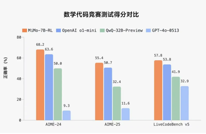 参数方面,根据介绍,小米经强化学习训练形成的MiMo-7B-RL模型,在数学推理(AIME 24-25)和代码竞赛(LiveCodeBench v5)公开测评集上,用7B参数规模,得分超过了OpenAI的闭源推理模型o1-mini和阿里Qwen开源推理模型QwQ-32B-Preview。