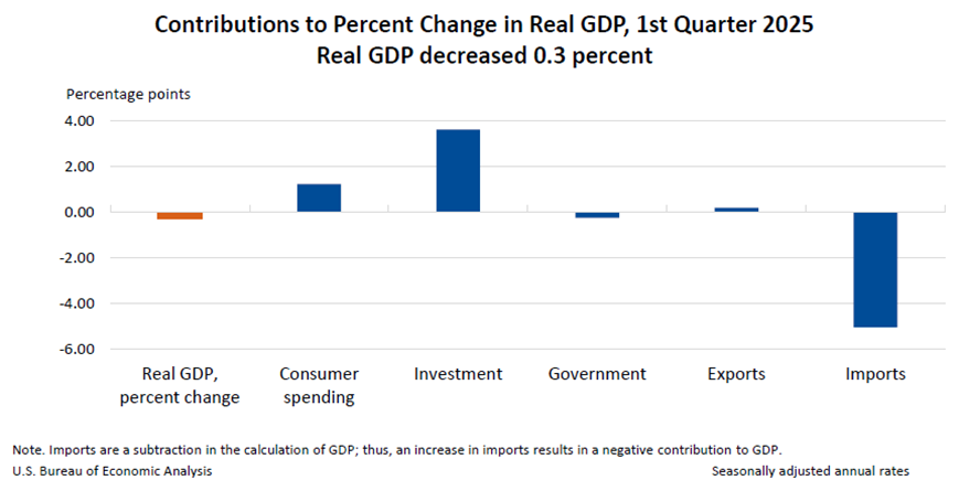 美国商务部表示,美国第一季度GDP萎缩主要受进口大幅增加和政府支出减少拖累。