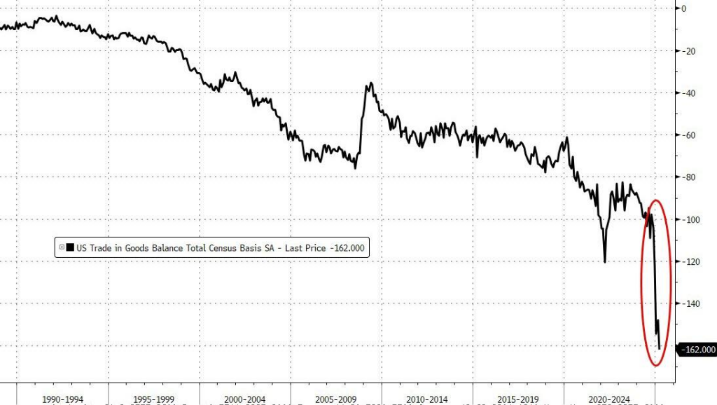本季度进口激增,原因是企业争相“提前备货”,即在预期和威胁生效的关税生效前囤积产品。美国商务部报告称,3月美国商品贸易逆差飙升至1620亿美元,远超2024年3月的928亿美元,创下自上世纪90年代初有记录以来的最高水平。这一数字未经通胀调整,超过了彭博社对经济学家的调查中所有预测值。