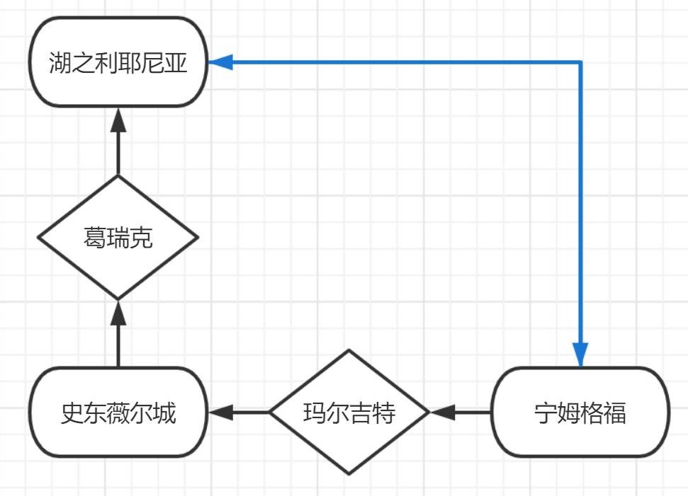 将地图拓扑结构化后如下图所示:蓝色双向箭头代表宁姆格福和湖之利耶尼亚之间的山路(上图右上角白圈处),可以双方向自由通行,但黑色箭头只能单方向通行。