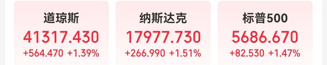 当地时间5月2日,美股高开高走,三大指数收盘均涨超1%。纳指涨1.51%;标普500指数涨1.47%;道指上涨564.47点,涨幅1.39%。其中,标普500指数、道指均连涨9日,标普500指数创2004年以来最长连涨纪录。
