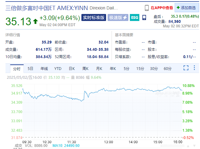三倍做多富时中国ETF大涨超9%。