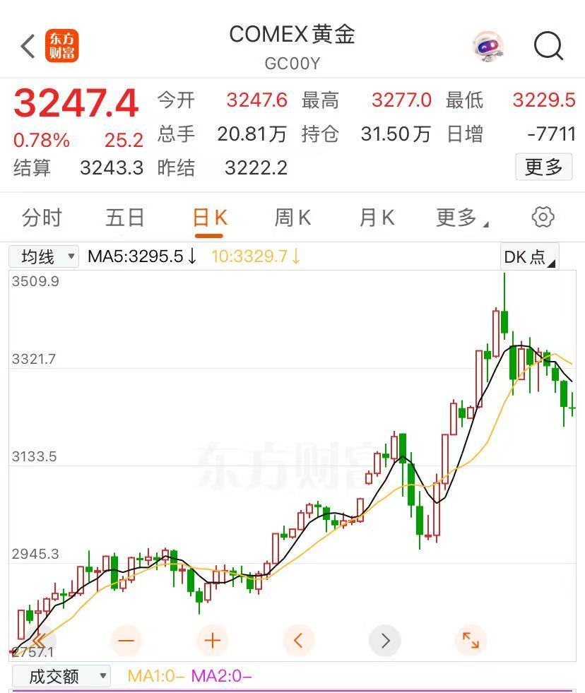 Wind数据显示,近期,国际金价整体回落,COMEX黄金期货5月2日收报3247.4美元/盎司,相比4月22日高点的3509.9美元/盎司,下降7.48%。