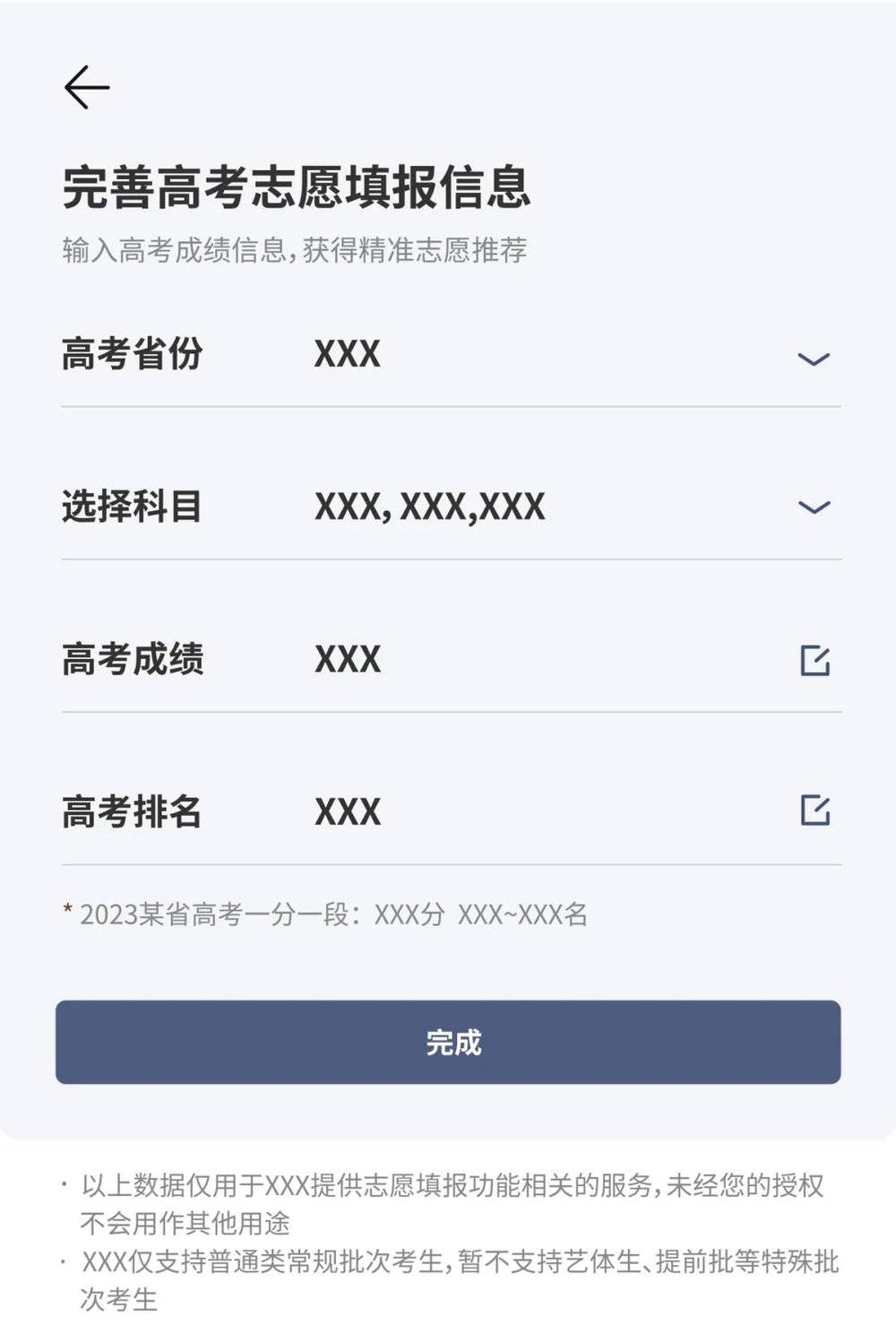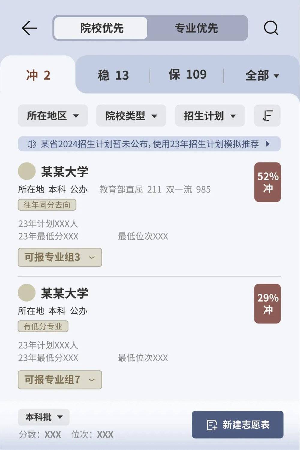以某软件的AI系统填报功能为例,用户首先需要填写高考所在的省份、所选科目、预估的分数以及考试位次。随后,系统会基于这些个性化信息,以历年的分数线为依据,智能地呈现“院校优先”“专业优先”两种不同的填报策略,以及“冲-稳-保”三个档次的志愿选择。