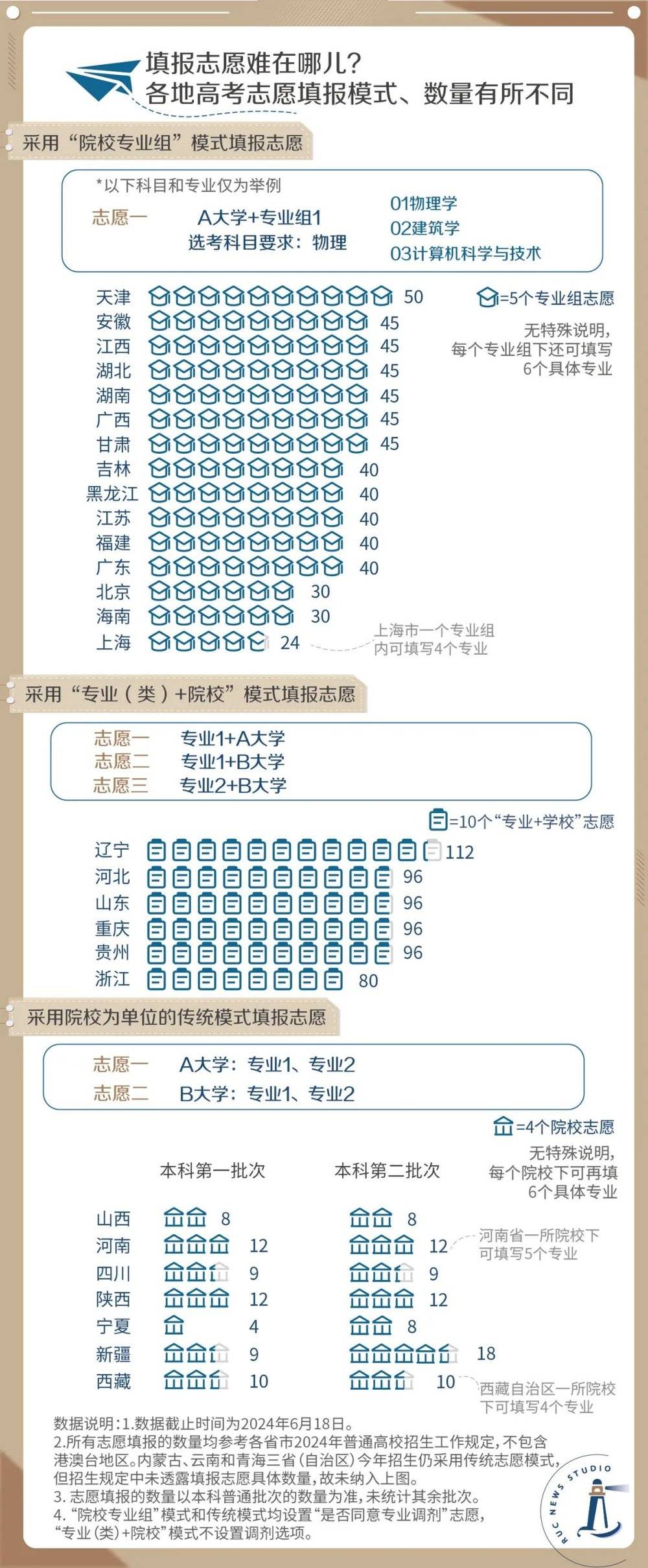 抛却规则的差别,这两种新型志愿填报模式都提供了更丰富的选择可能性。以2024年高考为例,在“院校专业组”模式下,天津市最多可以填报50个专业组志愿,每个专业组下还可最多再填写6个具体专业。而“专业(类)+院校”模式的选择更多,辽宁省的高考志愿填报数量最多可达112个。