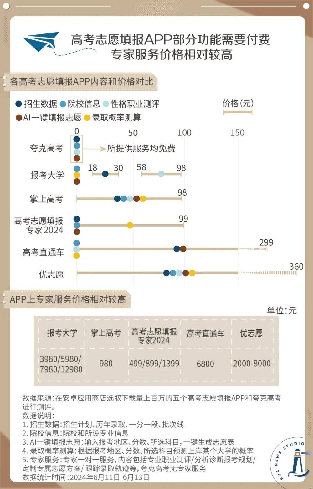为了比较线上APP的服务和价格,我们选取了目前下载量最高的5个付费高考志愿填报APP进行测评,并以免费志愿填报平台“夸克高考”作为对比。