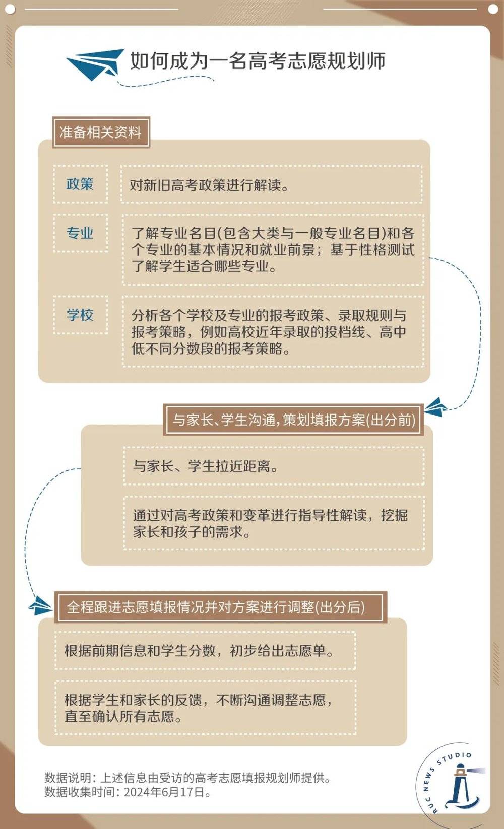 与培训内容相呼应,高考志愿规划师的工作也围绕着了解基本的报考信息,以及与考生和家长的沟通展开。通常来说,一名合格的规划师首先要了解政策、专业和学校等基本的报考信息,由此参考往年的录取情况,针对性地筛选出适合考生的学校范围,并根据考生的性格特征、能力和兴趣进一步筛选专业。