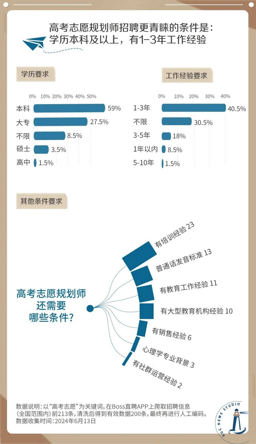 蓬勃发展的志愿填报行业需要源源不断的从业者来支撑。我们在某招聘软件上以“高考志愿”为关键词,获得了全国范围内梳理200份相关职位的招聘要求,结果发现,高考志愿规划师的入行门槛并不算高。