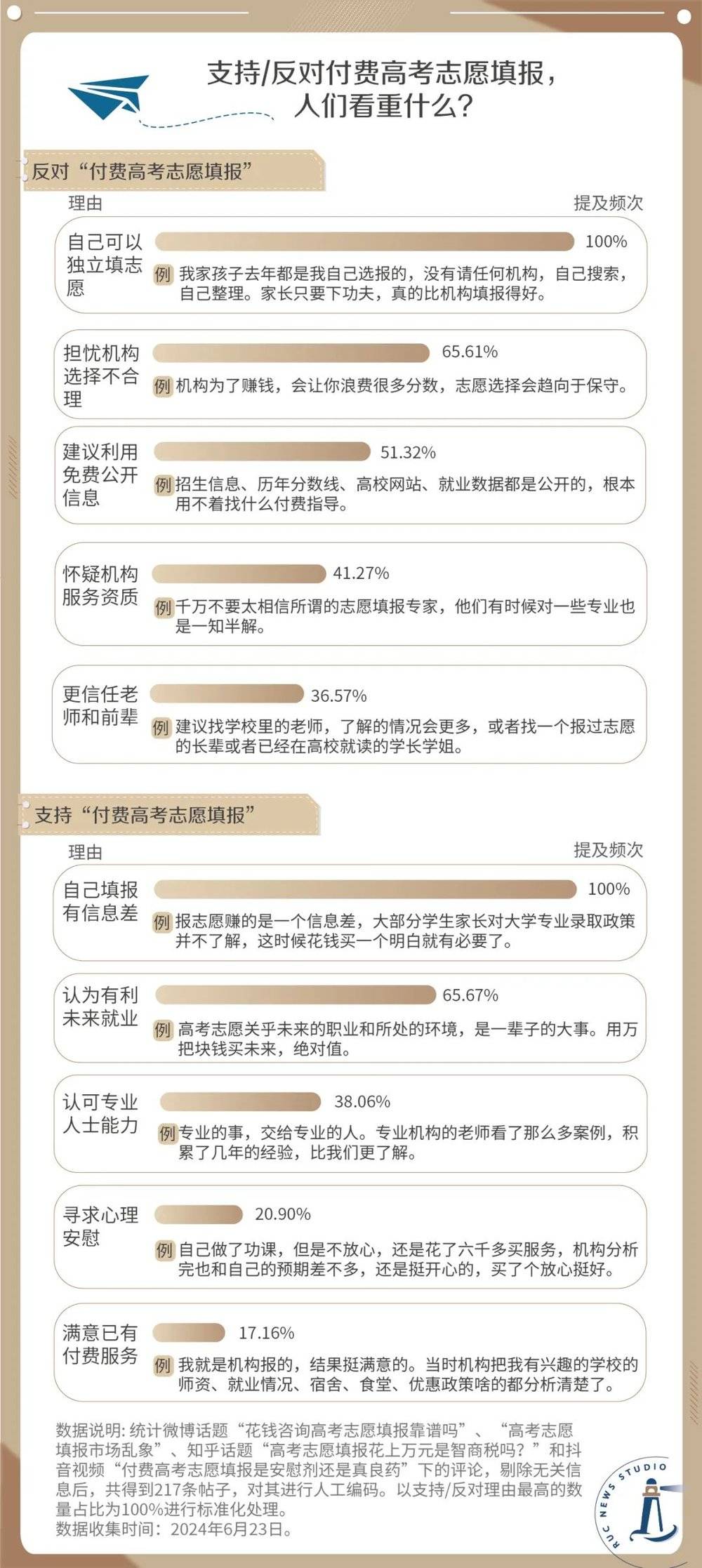 持反对意见其中占比最高的理由是“自己可以独立填志愿”。这一观点认为,高考志愿虽然复杂,但不至于是毫无头绪。通过相应的学习和研究,大多数考生和家人就可以完成填志愿。2024级北京考生小礼已经决定报考师范类院校,打算和家人一起研究历年的报考目录和分数线来填志愿。对她来说,购买志愿填报服务“太贵了,且没必要”。