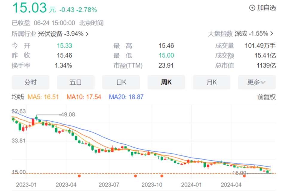 6月24日,隆基绿能股价跌到15.03元,创近四年来新低。跟2021年11月最高价73.20元相比,已经跌去近80%,年内就跌去三成多,总市值1139亿,跌破千亿市值近在咫尺。