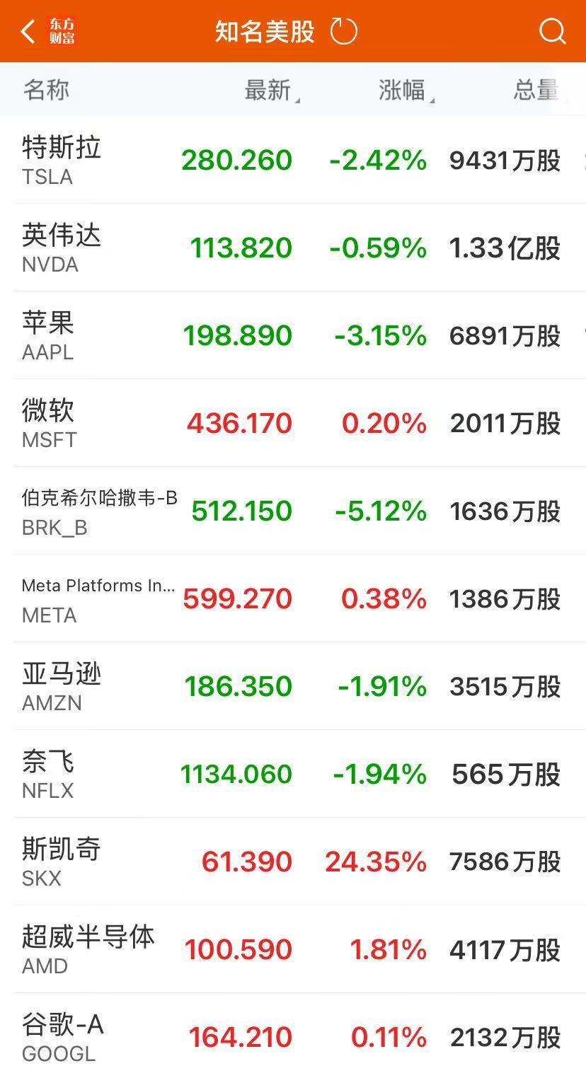 大型科技股多数下跌,苹果跌3.15%,微软涨0.20%,英伟达跌0.59%,谷歌涨0.14%,亚马逊跌1.91%,Meta涨0.38%,特斯拉跌2.42%,奈飞跌1.94%。