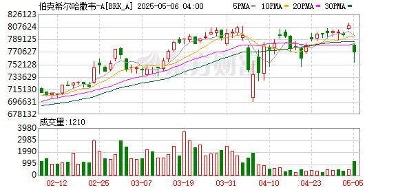 北京时间5月5日晚间,美股开盘后,伯克希尔·哈撒韦(以下简称伯克希尔)公司股价迅速下跌,伯克希尔-A和伯克希尔-B一度跌超6%。截至发稿,伯克希尔-A跌4.79%,伯克希尔-B跌4.83%。