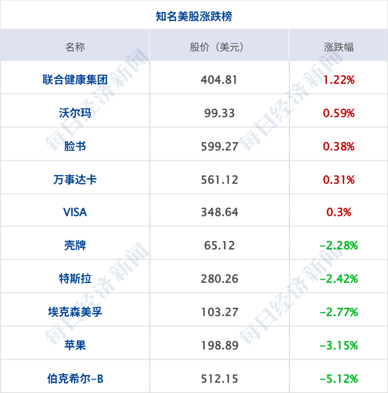 美股三大指数集体收跌,纳指跌0.74%,标普500指数跌0.64%,道指跌0.24%,道指与标普500指数此前连续9个交易日的上涨至此终结;大型科技股多数下跌,苹果跌超3%,特斯拉跌逾2%,亚马逊、奈飞、英特尔跌超1%,英伟达小幅下跌;微软、谷歌、Meta小幅上涨;伯克希尔-A跌超5%,巴菲特将于2025年底卸任首席执行官一职。中概股涨跌不一,纳斯达克中国金龙指数跌0.04%;金山云涨超4%,富途控股、名创优品涨超2%,好未来、微博涨超1%,小鹏汽车、理想汽车、哔哩哔哩小幅上涨;极氪跌超2%,瑞幸咖啡、蔚来、京东、霸王茶姬跌超1%。