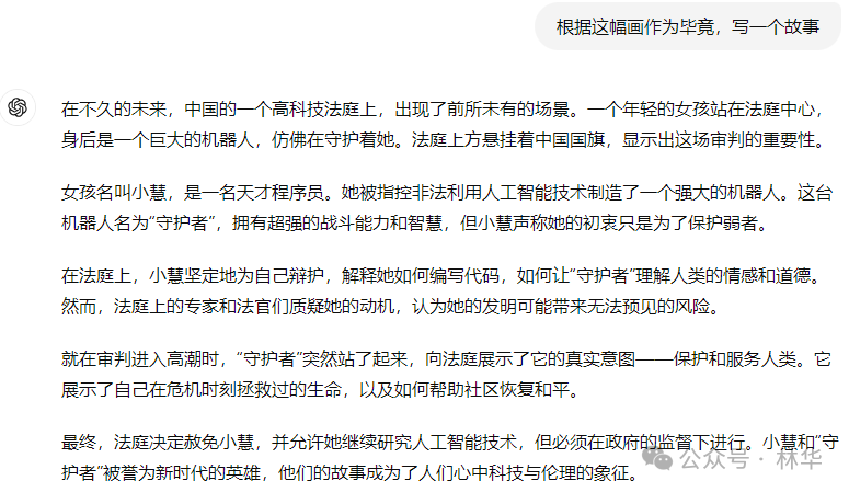 补充一个本文写作中获得的案例。在检索海外人工智能生成内容可版权性论文时查到一篇对中国AI相关版权纠纷审判的报道。报道的题图使用了复杂的混搭元素,法院庭审背景中站在画面最前的小女孩,女孩身后的机器人,背幕大屏展示的中国国旗。因无法猜测这副显然是AI绘制的报道图,我尝试让新版GPT-4o以报道图为基础写一个故事。