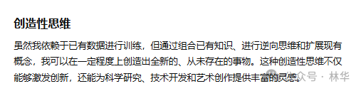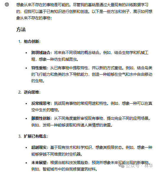 一个更简单的研究方法是直接和人工智能对话来进行测试。当然基于不同AI之间巨大的水平差异,只推荐和GPT-4及其以上版本实验。以下提供两张对其创造能力的问答截图。