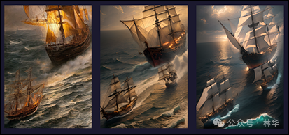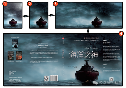 设计师在书封绘制中,“…..以《海洋之神》的书封为例,根据文本关键词先生成基础底图,再通过调整画面色调、主体位置和利用AI图片扩展功能,一键生成了书封全景图,最后排版完稿”。定稿这张乌云密布的海上幻境见下图: