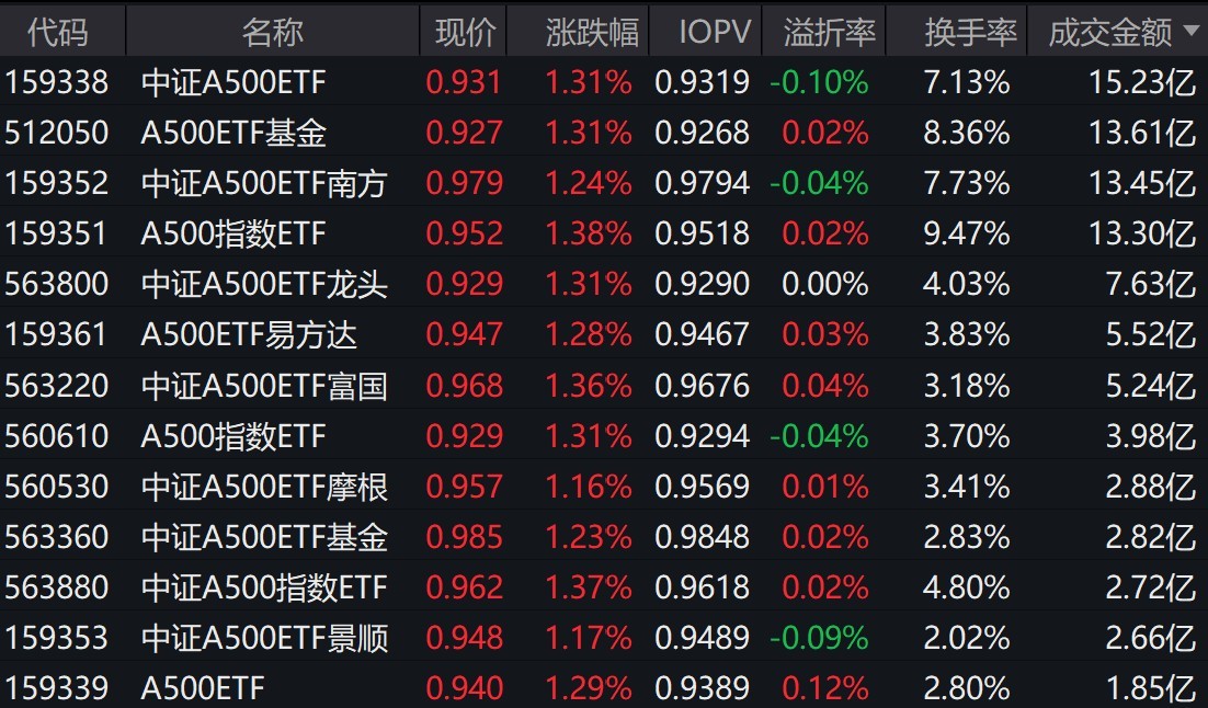 截至上午收盘,场内32只跟踪中证A500指数的ETF涨超1%,其中有13只中证A500相关ETF成交额超1亿元,4只超13亿元,中证A500ETF、A500ETF基金、中证A500ETF南方早盘成交额分别为15.23亿元、13.61亿元、13.45亿元。