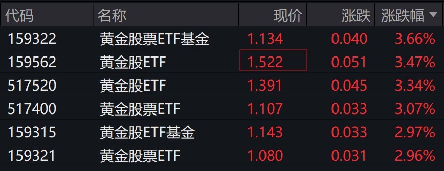 受盘面影响,多只跟踪中证沪深港黄金产业股票指数的ETF涨超3%。