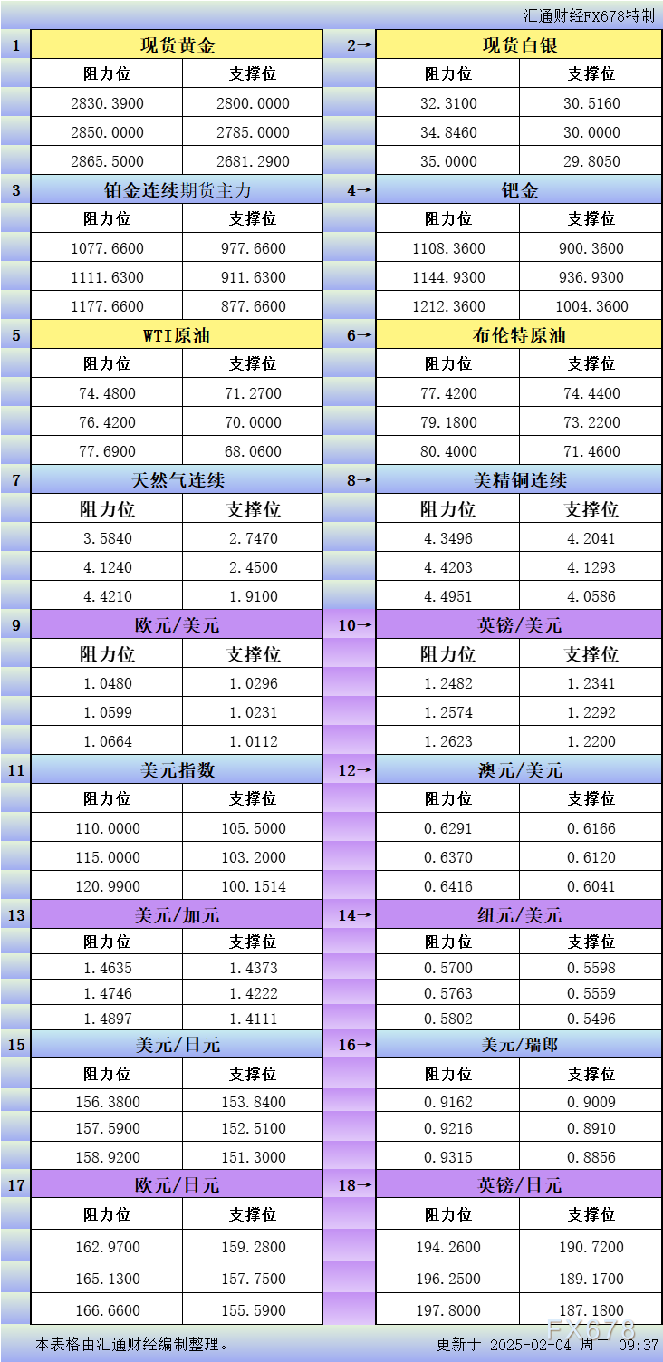 Home贵金属2月4日亚市更新支撑阻力:18品种支撑阻力(金银铂钯原油天然气铜及十大货币对) 贵金属 2025 年 5 月 8 日 2月4日亚市更新支撑阻力:18品种支撑阻力(金银铂钯原油天然气铜及十大货币对) By 古方信息网 - Advertisement - 文章来源:汇通网 2月4日亚市更新的黄金、白银、铂金、钯金、原油、天然气、铜(商品)以及:美元指数、欧元、英镑、日元、瑞郎、澳元、加元、纽元(热门货币对)的支撑阻力位一览。 - Advertisement - Must Read 基金 A股三大指数走出反包阳,超3900股收涨,关注A500ETF易方达(159361)等核心宽基投资价值 每日经济新闻 - 2026 年 4 月 12 日 - Advertisement - 股票 特朗普:伊朗正在输,而且是大输,他们28艘布雷艇都沉了!伊朗:已迫使美军舰从霍尔木兹海峡折返 2026 年 4 月 12 日 期货 谈崩了?伊美激烈交锋12小时 分歧严重!谈判细节曝光 2026 年 4 月 12 日 科技 基于 Rust 开发的 m3u8 下载器 M3U8Quicker:支持断点续传、边下边播 2026 年 4 月 12 日 Related News 基金 A股三大指数走出反包阳,超3900股收涨,关注A500ETF易方达(159361)等核心宽基投资价值 2026 年 4 月 12 日 股票 特朗普:伊朗正在输,而且是大输,他们28艘布雷艇都沉了!伊朗:已迫使美军舰从霍尔木兹海峡折返 2026 年 4 月 12 日 期货 谈崩了?伊美激烈交锋12小时 分歧严重!谈判细节曝光 2026 年 4 月 12 日 科技 基于 Rust 开发的 m3u8 下载器 M3U8Quicker:支持断点续传、边下边播 2026 年 4 月 12 日 24小时 美国副总统在伊斯兰堡召开新闻发布会 称美伊谈判未达成协议 2026 年 4 月 12 日 - Advertisement -