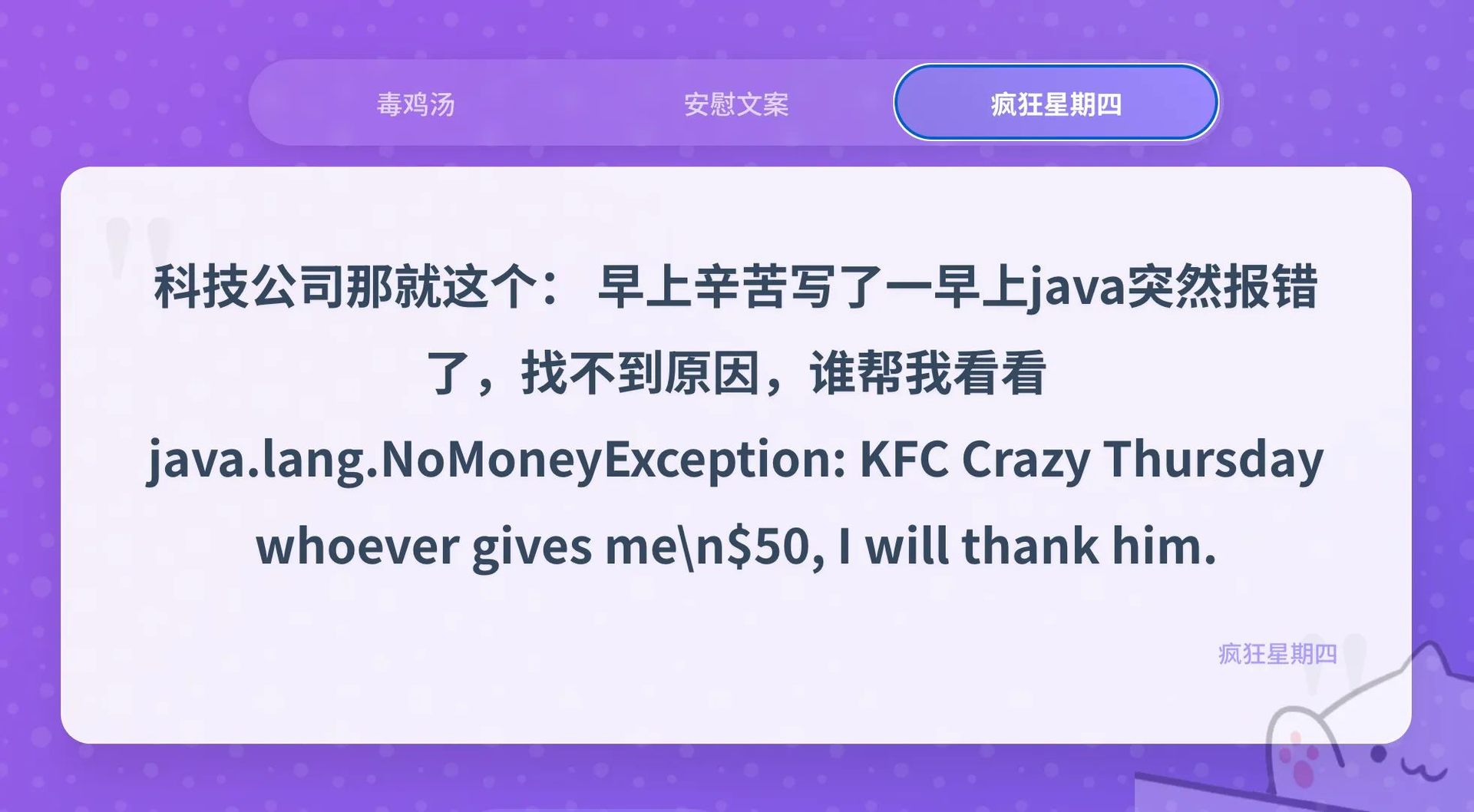 厌倦了千篇一律的鸡汤?想要一句扎心却又让你思考的 “毒” 语?渴望一份温暖的安慰来疗愈疲惫的心?或者只是想在每周四找到志同道合的 “肯德基疯狂星期四” 爱好者?