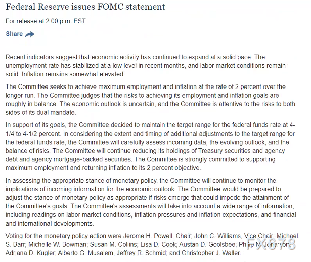 为支持其目标,委员会决定将联邦基金利率目标区间维持在4.25%-4.5%。在考虑对联邦基金利率目标区间的进一步调整的程度和时机时,委员会将仔细评估新公布的数据、不断变化的前景和风险平衡。委员会将继续减少其持有的美国公债、机构债和机构抵押贷款支持证券(MBS)。委员会坚决致力于支持充分就业并使通胀回到2%的目标。