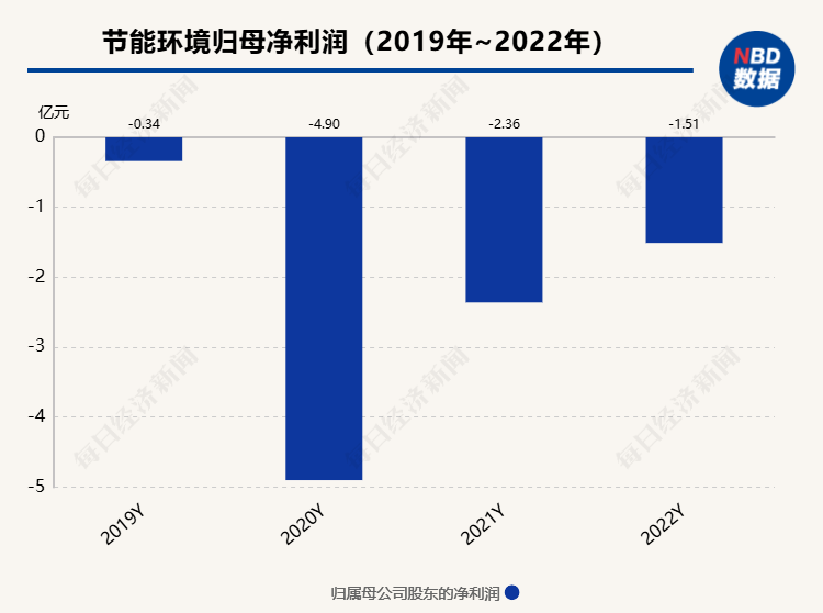 2019年至2022年,节能环境归母净利润分别为-0.34亿元、-4.90亿元、-2.36亿元、-1.15亿元,4年累计亏损超过8亿元。