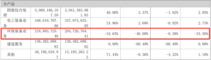 与之形成对比的是,曾作为核心业务之一的环保装备板块,在重组后地位持续弱化。报告期内,该板块实现营业收入2.19亿元,较去年同期下降了40.00%,目前仅占总营收的3.70%,毛利率为-34.65%,较去年同期下降了53.56%。