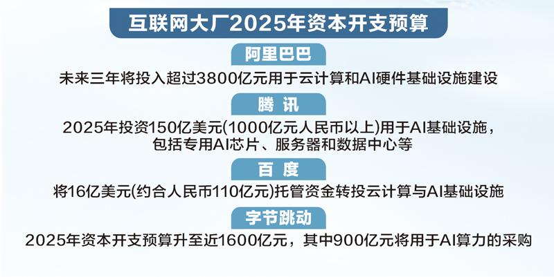 互联网大厂2025年的资本开支有望进一步提升。今年2月,阿里巴巴集团CEO吴泳铭宣布未来三年将投入超过3800亿元用于云计算和AI硬件基础设施建设;腾讯2025年计划投资150亿美元(1000亿元人民币以上)用于AI基础设施,包括专用AI芯片、服务器和数据中心等;百度宣布将16亿美元(约合人民币110亿元)托管资金转投云计算与AI基础设施;字节跳动2025年的资本开支预算升至近1600亿元,其中900亿元将用于AI算力的采购,700亿元则分配给IDC基建以及网络设备,如光模块、交换机等。