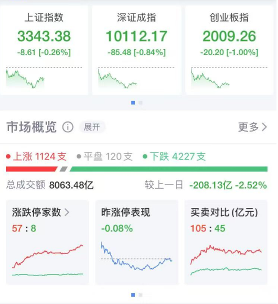 市场上,1124只个股上涨,4227只个股下跌,成交8063.48亿元。