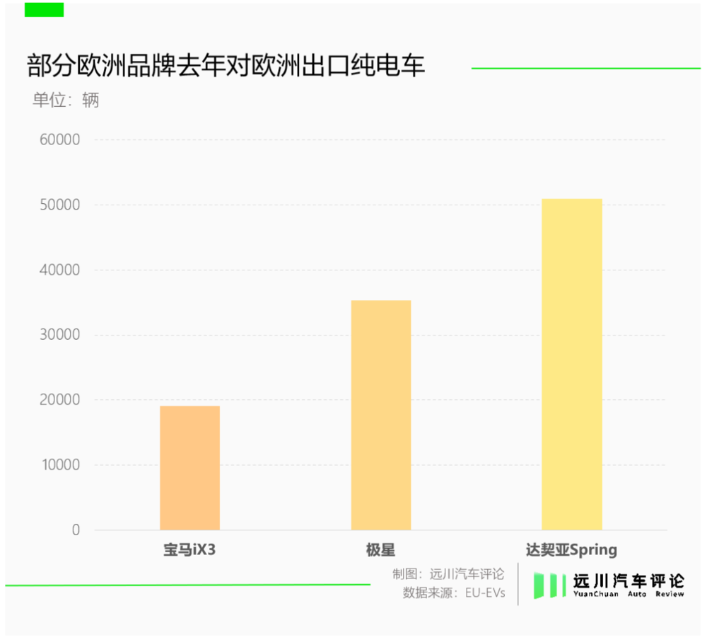 宝马在沈阳生产的iX3,去年在欧洲有近2万辆的销量。名义上是欧洲血统但生产都在中国的极星,去年在欧洲卖出约3.5万辆。而雷诺旗下品牌达契亚的畅销车型Spring,去年在欧洲销量近5万辆,它们在十堰生产。沃尔沃今年在欧洲爆单的EX30则在台州生产。