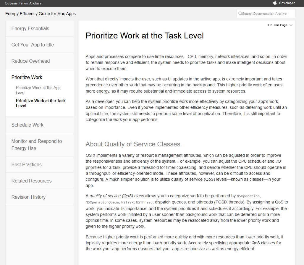 根据苹果官网上的文档显示,苹果的开发者可以设置进程的QoS等级,然后系统可以根据QoS优先级来调度。