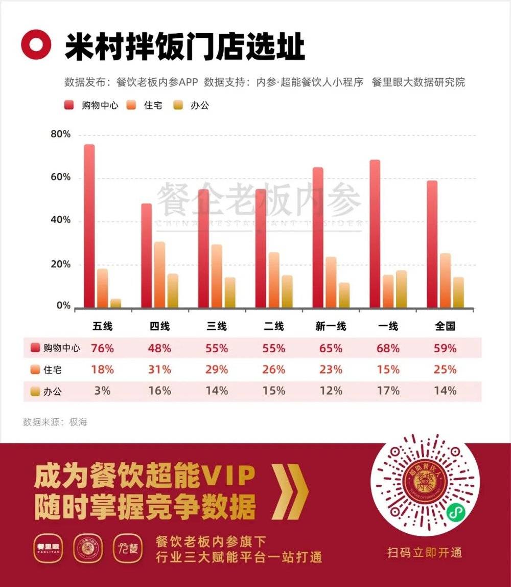近些年最为成功的案例当属米村拌饭。口罩期间,米村拌饭“抄底”商场,拿下了不少核心商圈的战略位置,比如北京国贸CBD、华贸、合生汇等,迅速打开了品牌声量。据极海数据显示,如今59%的米村拌饭都分布在商场。