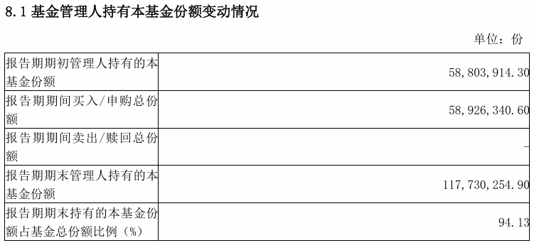 在这次自购之前,基金公司就已经持有5880万份,自购之后,累计持有份额达1.18亿份,占基金总份额的比例超过94%,可以看出大部分都是基金公司自己持有。