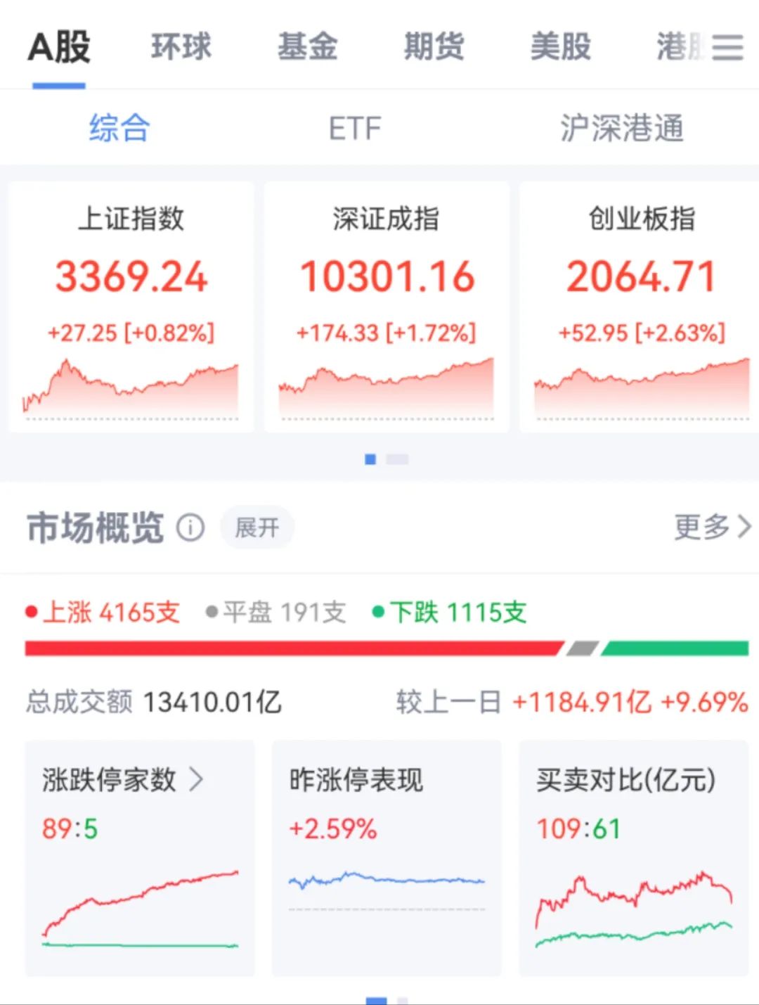5月12日,市场全天高开高走,创业板指领涨。A股全天总成交额1.34万亿元,较上个交易日放量1184.91亿元。盘面上,市场热点集中在军工、机器人等方向,个股涨多跌少,全市场超4100只个股上涨。截至收盘,沪指涨0.82%,深成指涨1.72%,创业板指涨2.63%。