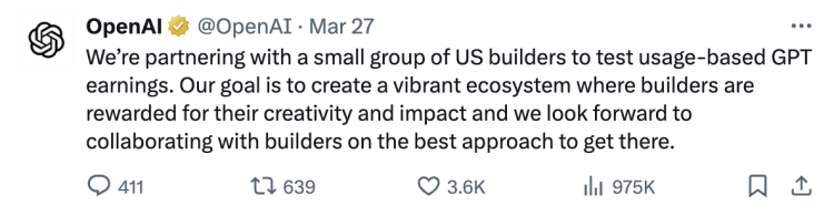 到3月底,眼看GPTs快要“凉凉”,OpenAI不得不紧急决定与小部分美国开发者合作,基于GPTs的使用情况发放相应奖励。目标是“创建一个充满活力的生态系统,让开发者的创造力和影响力得到回报”。至于更具体的奖励细节,OpenAI并未披露。