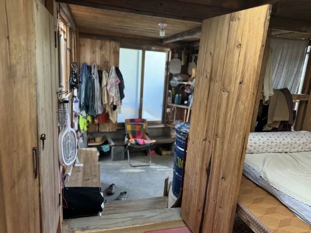 搞掂了通透,再对付狭小。用老谷仓建小房子是早就想好的,但是内部并不追求极致紧凑。大谷仓也称“六尺仓”,两米见方,其实内径1.95米,不到四平方。稍稍加宽,由1.95米变成了2.2米。考虑到收纳需求,又将右侧向外延展,就有了壁橱兼书架,放四季衣物,和我正在读的书。